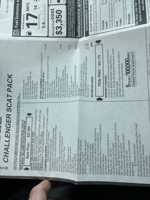 ''QUICK TURNOVER PRICE'' THIS 2015 DODGE CHALLENGER R/T SCAT PACK COMES EQUIPPED WITH 6.4 LITER V-8 ENGINE, MANUAL 6 SPEED TRANSMISSION, HEATED AND COOLED SUEDE SEATS, BLUETOOTH, BACKUP CAMERA, ALLOY WHEELS, POWER WINDOWS, LOCKS, MIRRORS, CRUISE CONTROL, CD PLAYER, A/C, AIRBAGS, PLUS MUCH MORE. PLEASE CALL AHEAD FOR DETAILS, ALL VEHICLES HAVE ALREADY BEEN DETAILED BUT NOT ALL VEHICLES HAVE BEEN THROUGH OUR SERVICE CENTER YET. THANK YOU FOR YOUR INTEREST AND PLEASE CALL 717-625-4444 FOR ANY DETAILS OR QUESTIONS OR STOP BY OUR FAMILY OWNED DEALERSHIP IN LITITZ PA FOR A TEST DRIVE.